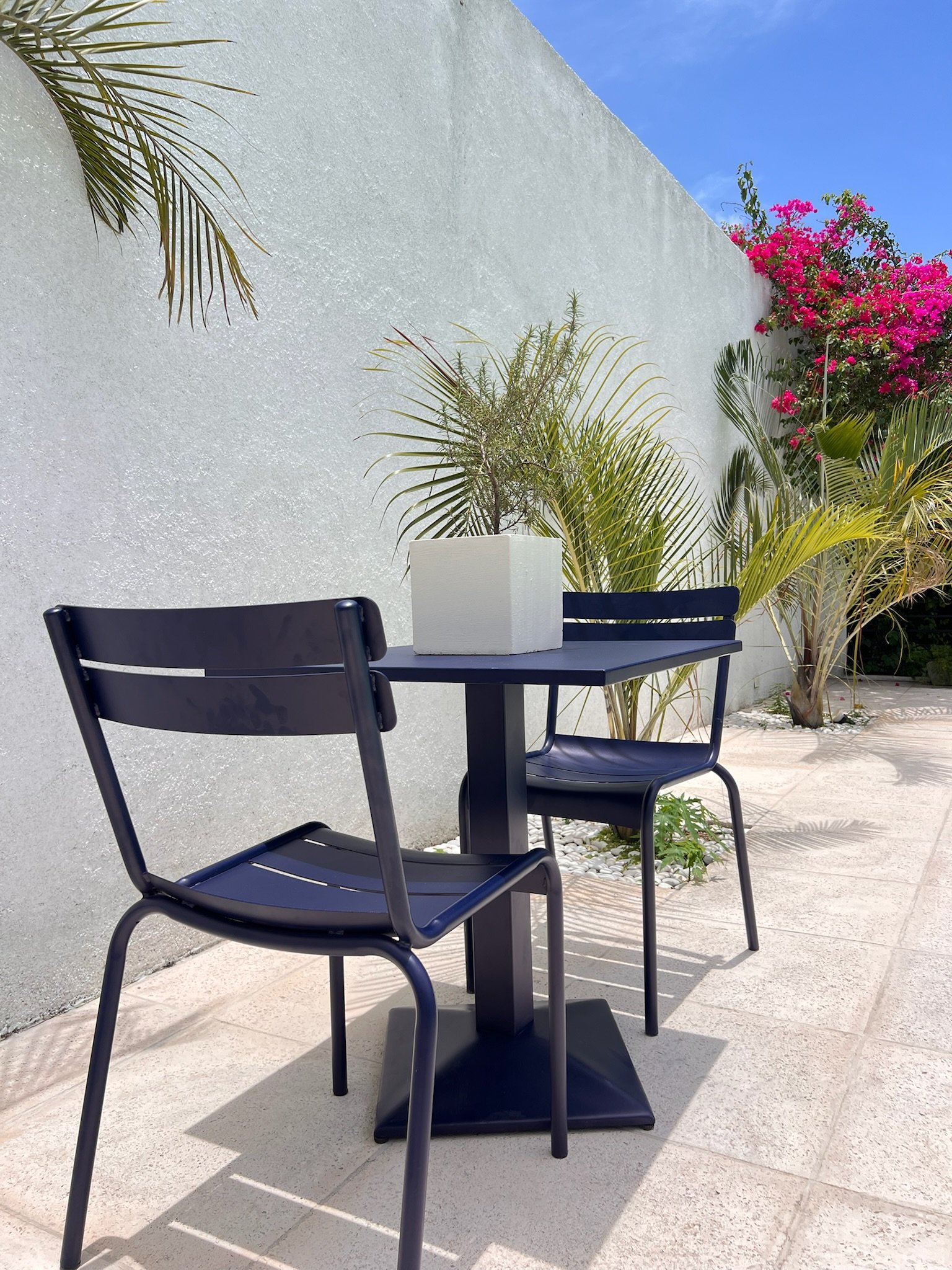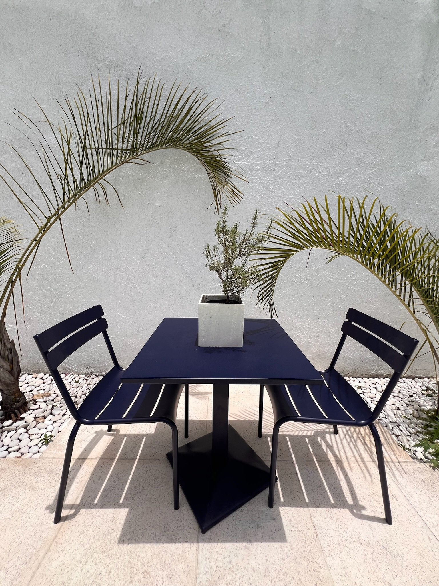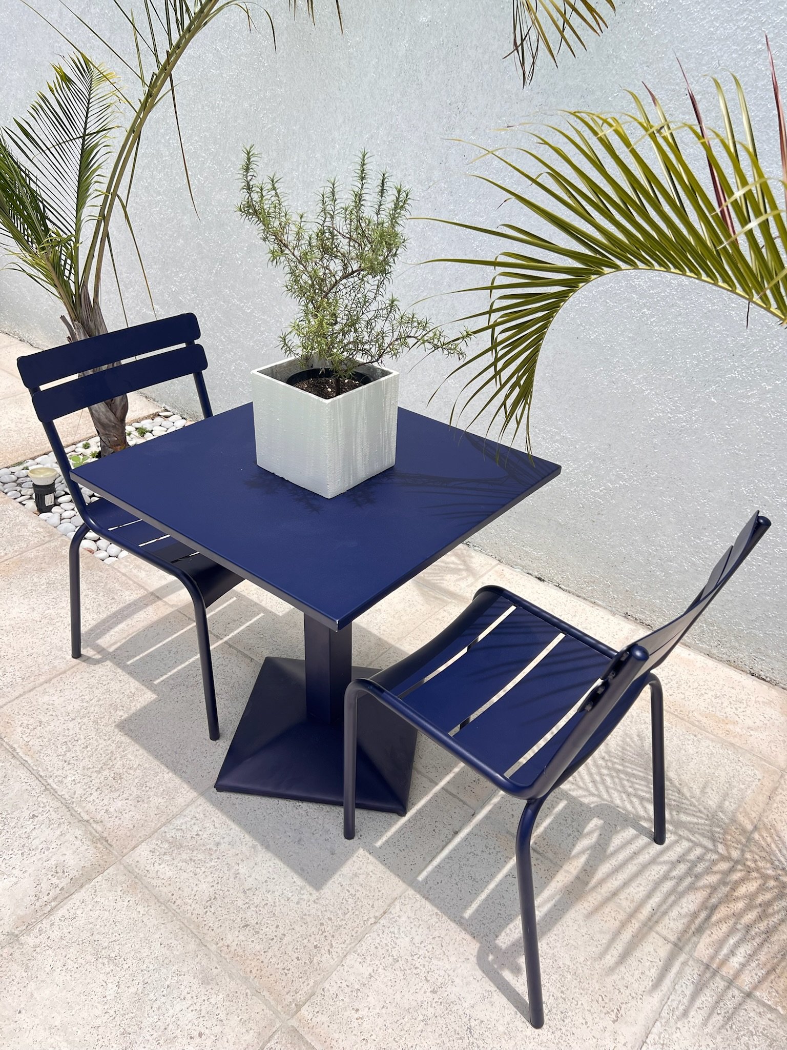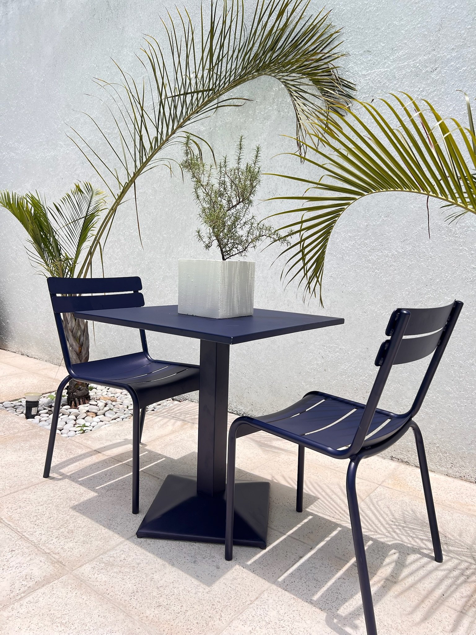 Add modern elegance to your outdoor space with the Tova Navy Blue Set. This 4-piece ensemble includes three stylish black-framed chairs with navy blue seats and one matching square table. Designed for durability and comfort, it’s perfect for casual gatherings or relaxing moments, bringing a refined contemporary touch to any patio or balcony.